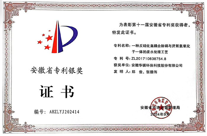 9月3日,安徽省市場監(jiān)督管理局(安徽省知識產(chǎn)權(quán)局)公示了第十一屆安徽省專利獎(jiǎng)評選結(jié)果。華騏環(huán)?!耙环N反硝化集耦合除磷與厭氧氨氧化于一體的廢水處理工藝”發(fā)明專利榮獲安徽省專利銀獎(jiǎng)。