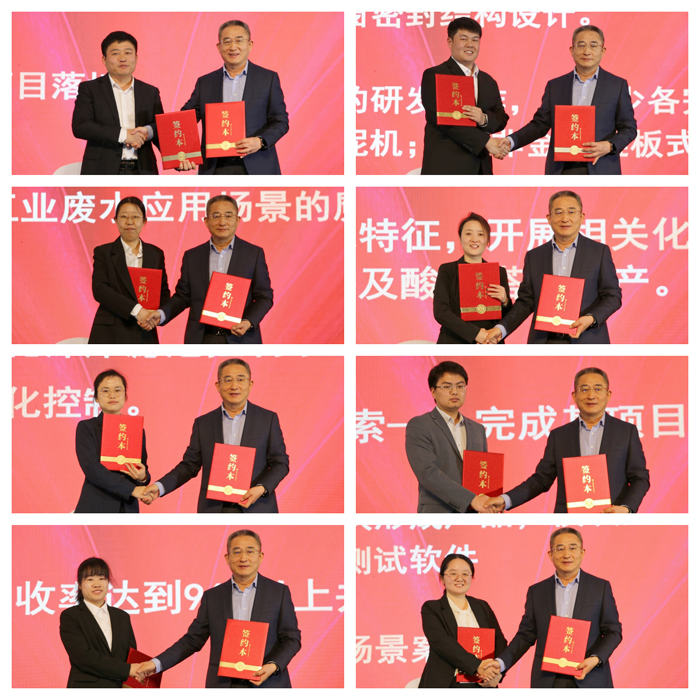 盛典在市經(jīng)開區(qū)管委會副主任方強的致辭中拉開了帷幕,在接下來的產(chǎn)品推介會上,來自裝配式水廠、深床反硝化濾池系統(tǒng)、高效/磁混凝系統(tǒng)、BAF智慧工藝、臭廢氣收集及處理系統(tǒng)、工業(yè)物聯(lián)智能控制產(chǎn)品及系統(tǒng)、魔方智水產(chǎn)品、環(huán)保非標設備八個團隊的產(chǎn)品經(jīng)理從市場角度出發(fā),分享了各自技術(shù)化產(chǎn)品的新功能、新亮點以及產(chǎn)生的效益,并規(guī)劃了2025年的市場工作、產(chǎn)品應用場景擴展、升級的思路及目標。隨后,會議舉行了八位產(chǎn)品經(jīng)理與副董事長鄭俊簽約及市場銷售人員誓師儀式。