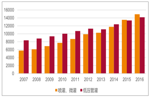 2011年國務(wù)院發(fā)布《關(guān)于加快水利改革發(fā)展的決定》,提出未來十年平均每年投資4000億以上的規(guī)模進(jìn)行水利建設(shè),國家對于農(nóng)田水利的投資大幅增加?!笆濉逼陂g,全國共完成農(nóng)田水利基本建設(shè)投資1.61萬億元,年均超過3000億元。也正是從“十二五”開始,我國農(nóng)田節(jié)水工程建設(shè)進(jìn)入快速發(fā)展時期,噴灌、微灌、低壓管灌面積不斷增長。