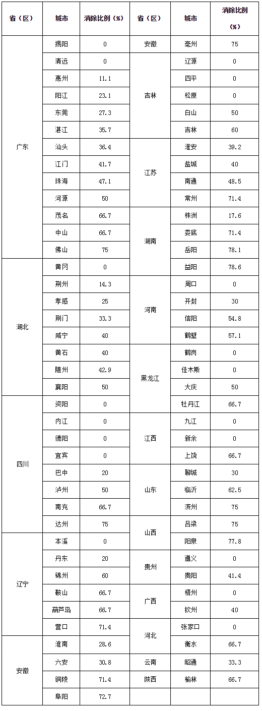 根據(jù)排查結(jié)果,全國共有77個城市黑臭水體消除比例低于80%,涉及廣東(13個城市,下同)、湖北(8個)、四川(8個)、遼寧(6個)、安徽(5個)、吉林(5個)、江蘇(4個)、湖南(4個)、河南(4個)、黑龍江(4個)、江西(3個)、山東(3個)、山西(2個)、貴州(2個)、廣西(2個)、河北(2個)、云南(1個)、陜西(1個)。其中,四川省內(nèi)江、德陽、資陽、宜賓,吉林省遼源、四平、松原,廣東省揭陽、清遠,江西省九江、新余,黑龍江省鶴崗、佳木斯,湖北省黃岡,貴州省遵義,遼寧省本溪,廣西壯族自治區(qū)梧州,河北省張家口,河南省周口等19個城市消除比例為0。具體城市名單及消除比例見附表。