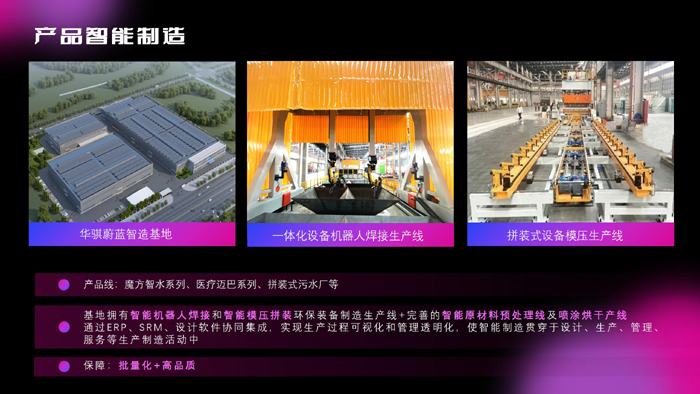 華騏環(huán)保旗下的蔚藍智能裝備制造基地,擁有包括魔方智水系列、拼裝式污水廠系列、醫(yī)療邁巴系列、精細格柵系列等多條產(chǎn)品線。