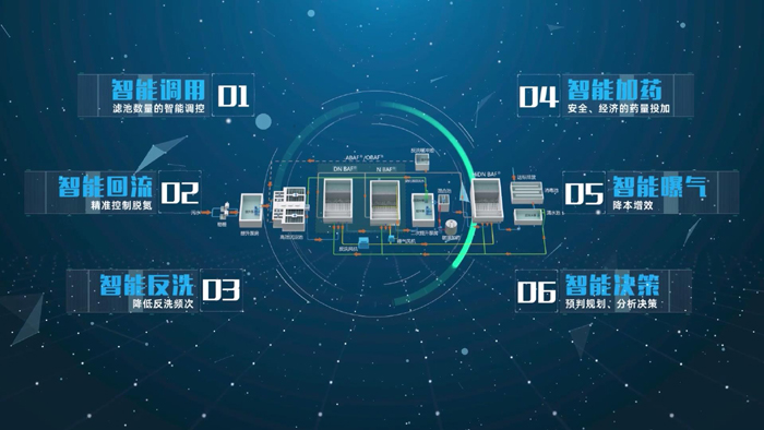 BAF智慧濾池智能調(diào)用、智能回流、智能反洗、智能加藥、智能曝氣、智能決策六駕“馬車(chē)”齊發(fā)力,充分發(fā)揮AI 人工智能在水廠運(yùn)營(yíng)中的有力作用。智能調(diào)用系統(tǒng)自動(dòng)計(jì)算濾池運(yùn)行數(shù)量,根據(jù)用戶(hù)需求交替啟用,確保冬季低溫下出水水質(zhì)穩(wěn)定達(dá)標(biāo),同時(shí)降低曝氣能耗;智能回流系統(tǒng)實(shí)時(shí)調(diào)控回流比,解決了硝化液回流過(guò)量的問(wèn)題,確保濾池精準(zhǔn)脫氮,大幅節(jié)省電耗;針對(duì)不同功能的濾池,智能反洗系統(tǒng)通過(guò)選用循環(huán)洗、降水位反沖洗、強(qiáng)制反洗等模式,提高反洗效率,降低反洗頻次,節(jié)省電耗;智能加藥系統(tǒng)結(jié)合進(jìn)水水質(zhì)水量,AI智能投加反硝化碳源,確??偟_(dá)標(biāo)的前提下大幅度降低藥耗;智能曝氣系統(tǒng)充分考慮氣泡經(jīng)濾料剪切帶來(lái)溶解氧升高的影響,實(shí)現(xiàn)按需供氧,降低曝氣能耗;智能決策系統(tǒng)根據(jù)運(yùn)營(yíng)需求,對(duì)不同控制模塊的經(jīng)濟(jì)性、安全性、穩(wěn)定性進(jìn)行綜合比選,制定精準(zhǔn)、有效的控制方案。