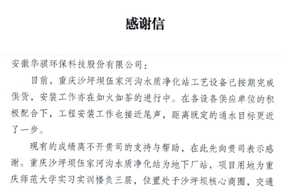 近日,長江三峽綠洲技術(shù)發(fā)展有限公司向安徽華騏環(huán)??萍脊煞萦邢薰景l(fā)來感謝信,對(duì)華騏環(huán)保工作人員在建設(shè)重慶沙坪壩伍家河溝水質(zhì)凈化站項(xiàng)目過程中,高效、有序的保障了項(xiàng)目…
